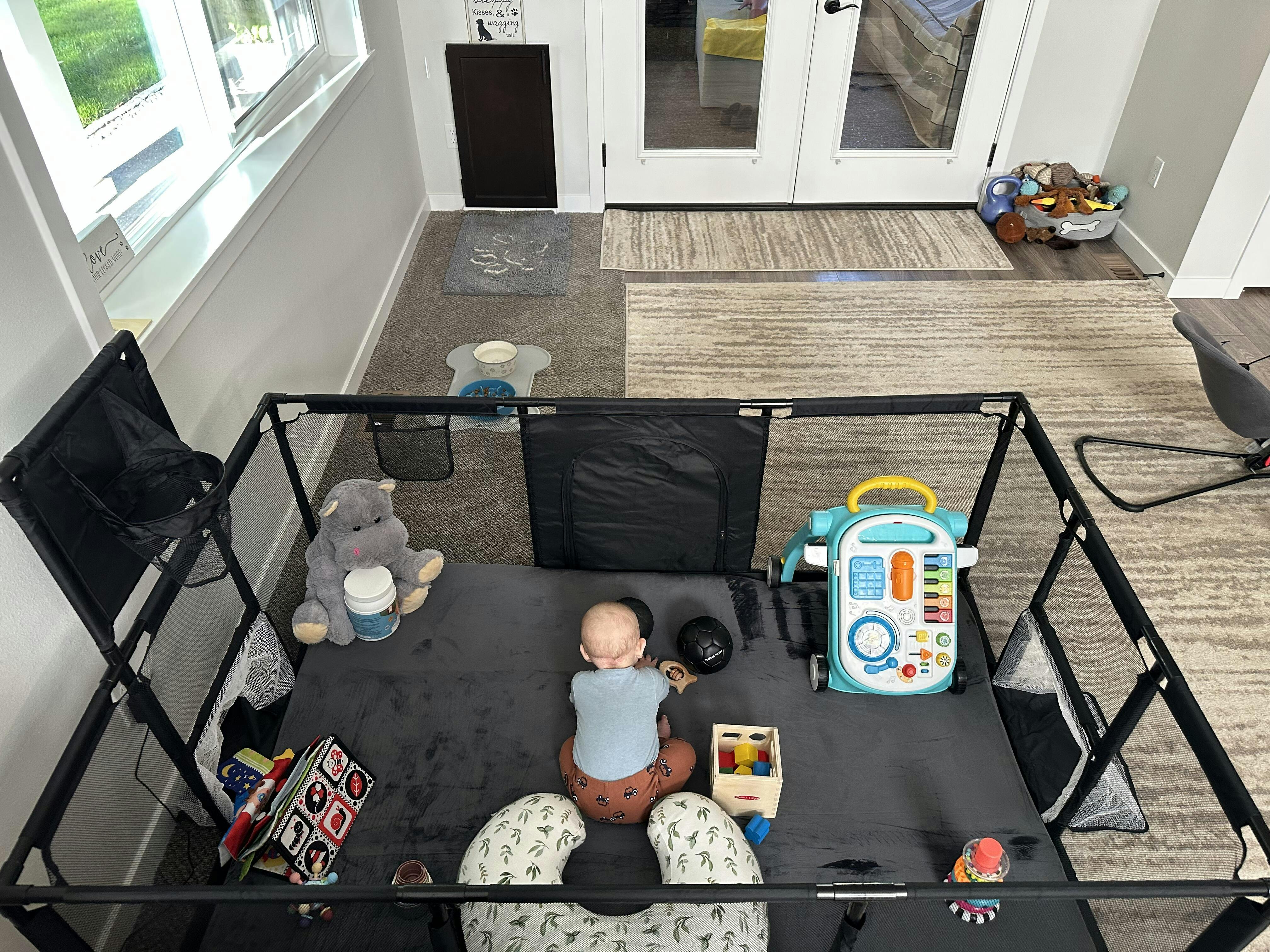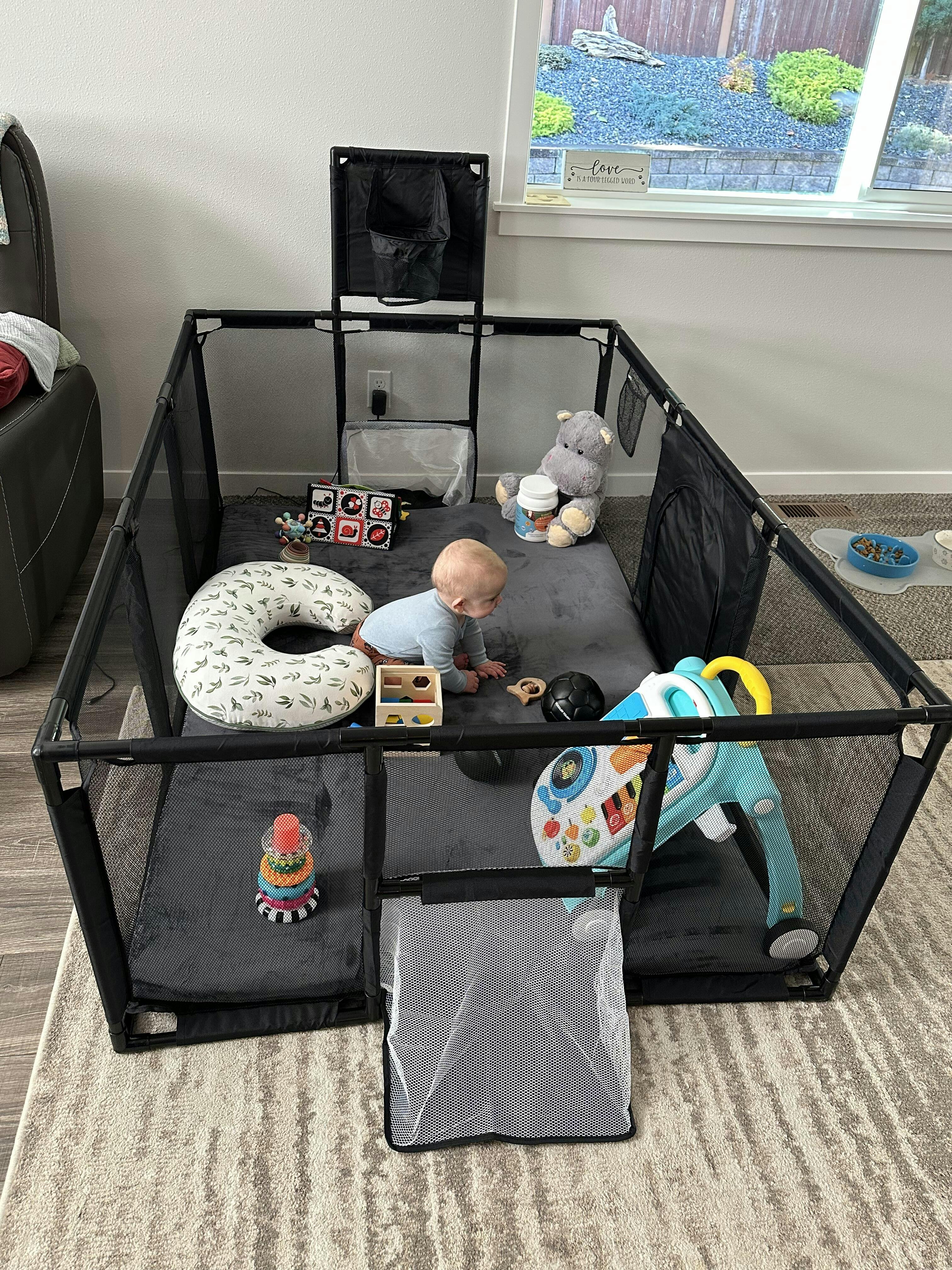 After researching extensively, I was initially leaning towards a basic mesh playpen since my son loves swinging on his cot, and a wooden playpen wasn’t a viable option. Fortunately, I discovered Toddler Tough! I bought the grey version to match my beige living room, and it blends perfectly. I love this playpen for its durability, easy cleaning (just spray and wipe), and the fact that it will grow with my son's abilities. He enjoys crawling around freely and safely, and he's starting to stand and reach the top rail. Soon, he’ll be shooting hoops, punching the boxing bag, and kicking goals. I appreciate that I won’t need to upgrade as he grows. Highly recommend—it's also lightweight and perfect for moving outside on warmer days.